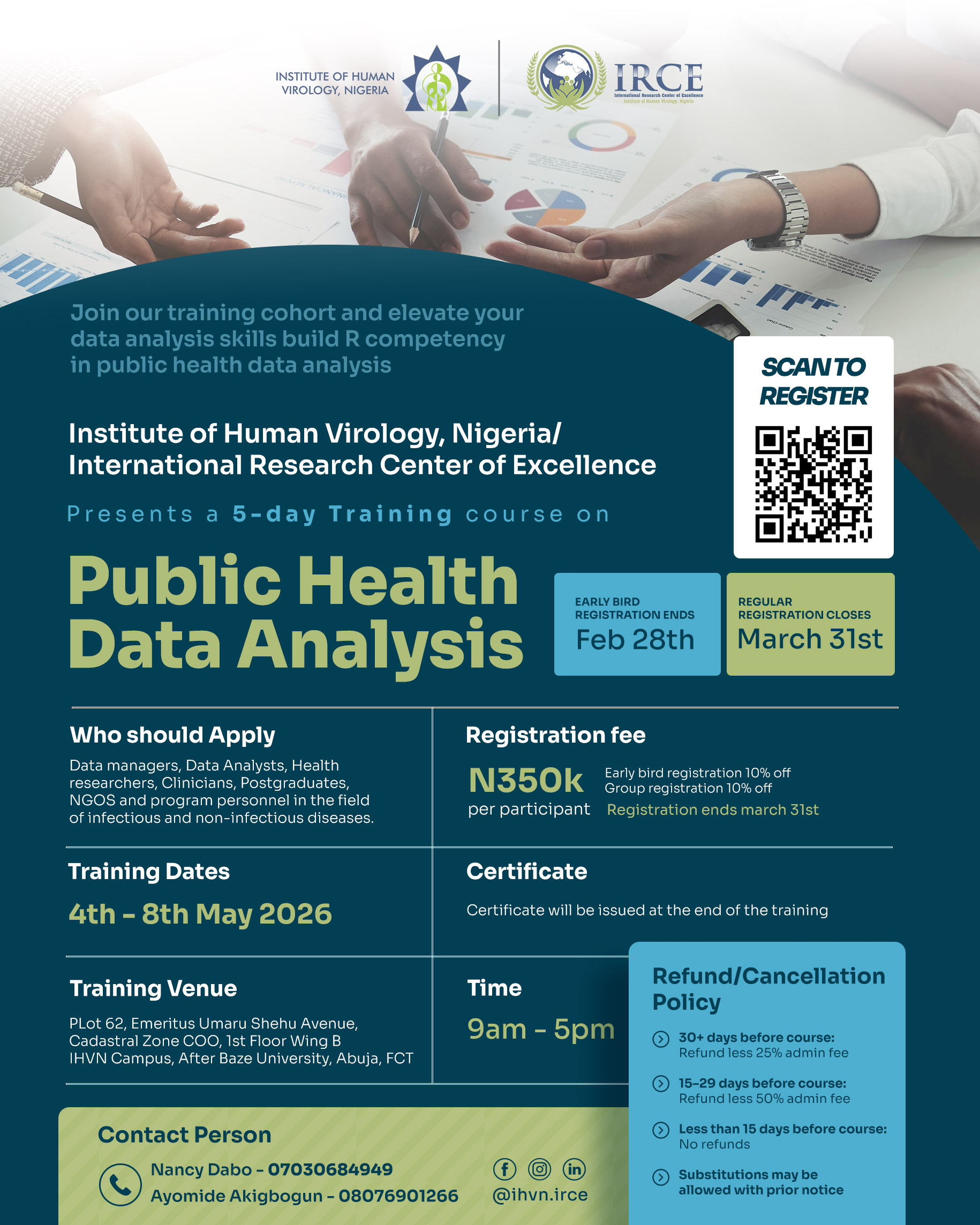 The International Research Centre of Excellence (IRCE) at the Institute of Human Virology Nigeria (IHVN) has opened registration for a five-day intensive Public Health Data Analysis Training course scheduled for 4th to 8th May, 2026 in Abuja.